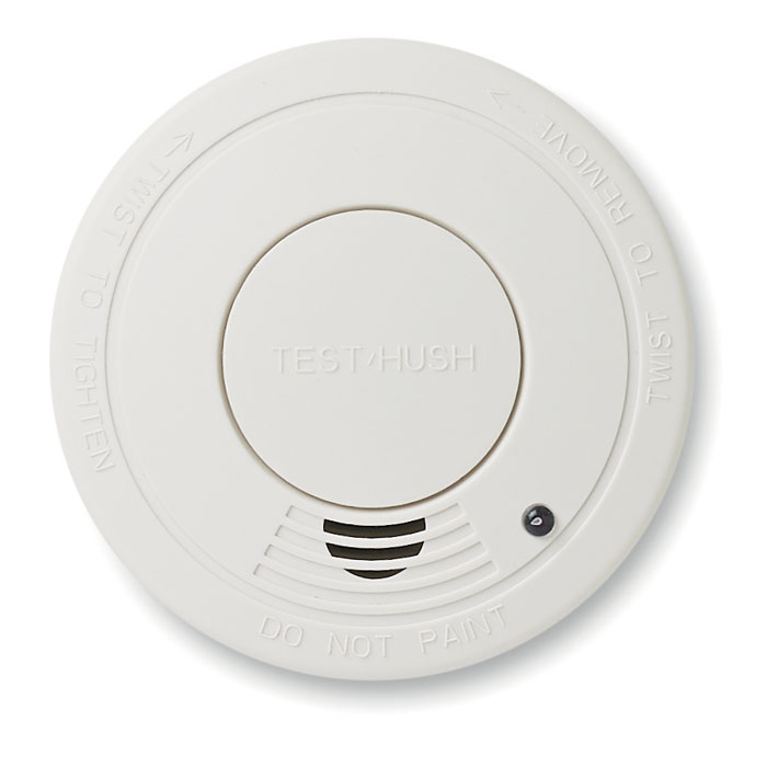 Palohälytin muovikotelossa punaisella käyttövalolla, takana 2 ruuvia kiinnittämistä varten. Sisältää kaksi 6F22 9V patteria.