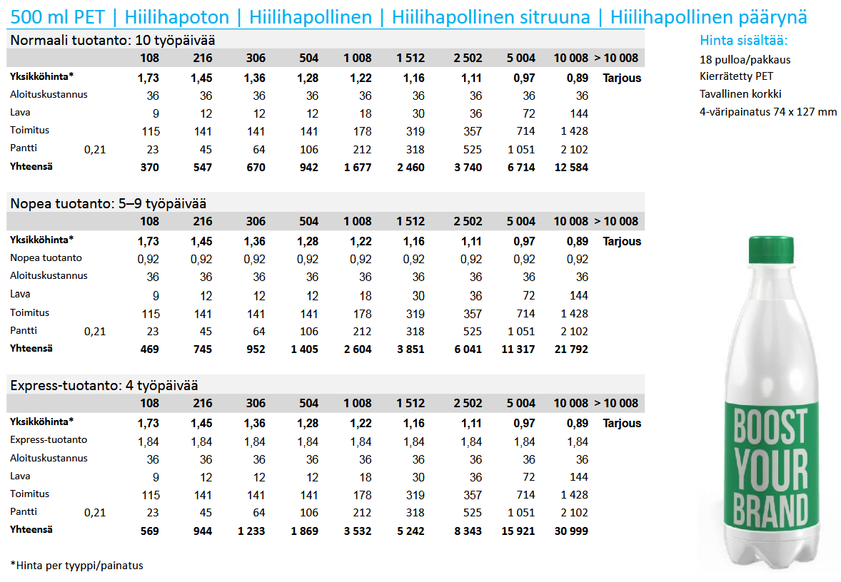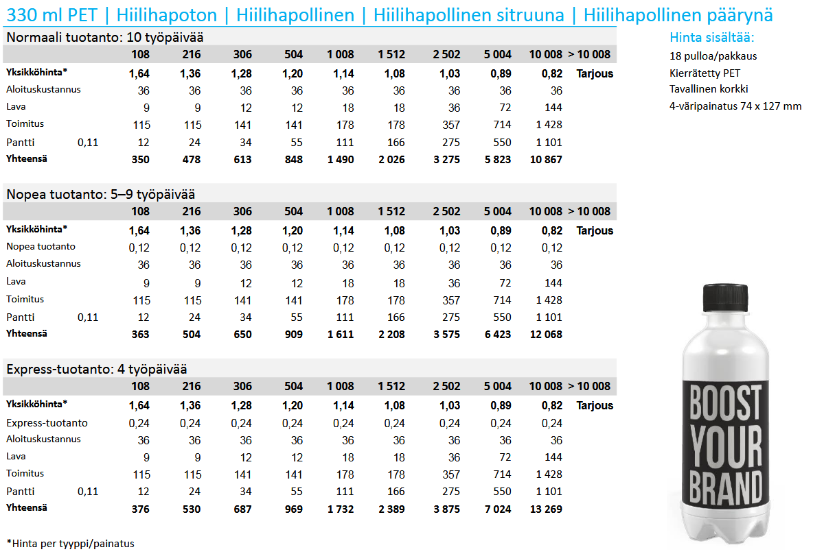 Profiloituja vesiä, mainosvesiä ja profiloituja juomia kaikkiin tilaisuuksiin! Valitse neljästä vaihtoehdosta teille se sopivin! Tuoteprofiili vesi/tarjottava vesi on erinomainen vaihtoehto, kun jokainen työntekijä, vierailija, asiakas tai vieras tarvitsee turvallisen ja kestävän vaihtoehdon ja saa oman pullon brändättynä. Sopii täydellisesti takin taskuun tai käsilaukkuun. Pullo on täytetty luonnollisella ja aidolla vedellä.