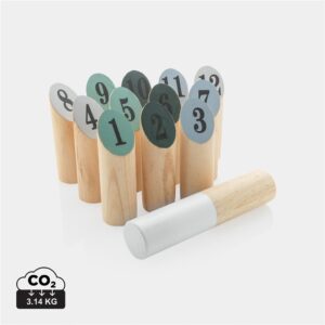 Tämä addiktoiva taktinen peli haastaa pelaajat heittämään puisen palikan kohti kahtatoista seisovaa puupalikkaa. Ensimmäinen pelaaja, joka saa tasan 50 pistettä, on voittaja. Yli 50 pisteen määrää ei saa ylittää. Se näyttää helpolta, mutta on todella haastavaa! Kun palikat ovat kaatuneet, nostetaan ne takaisin ylös. Setti sisältää 12 numeroitua palikkaa sekä 1 puisen heittopalikan. Kaikki palikat on valmistettu männystä. Sisältää puuvillapussin sekä sääntökirjan.