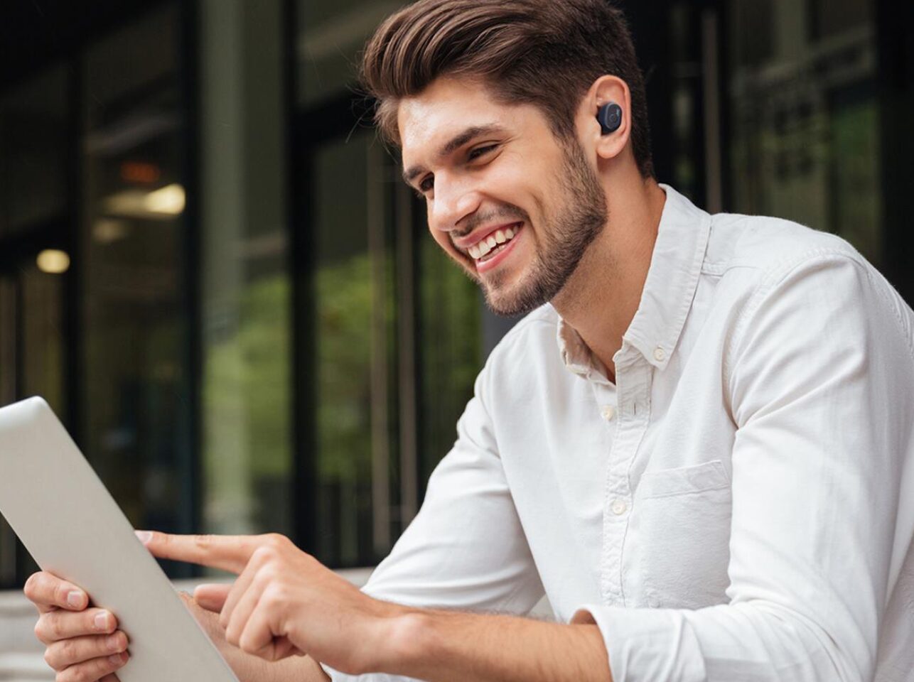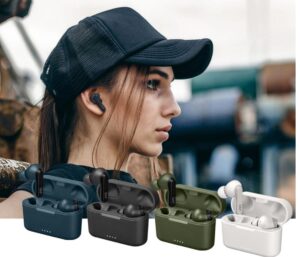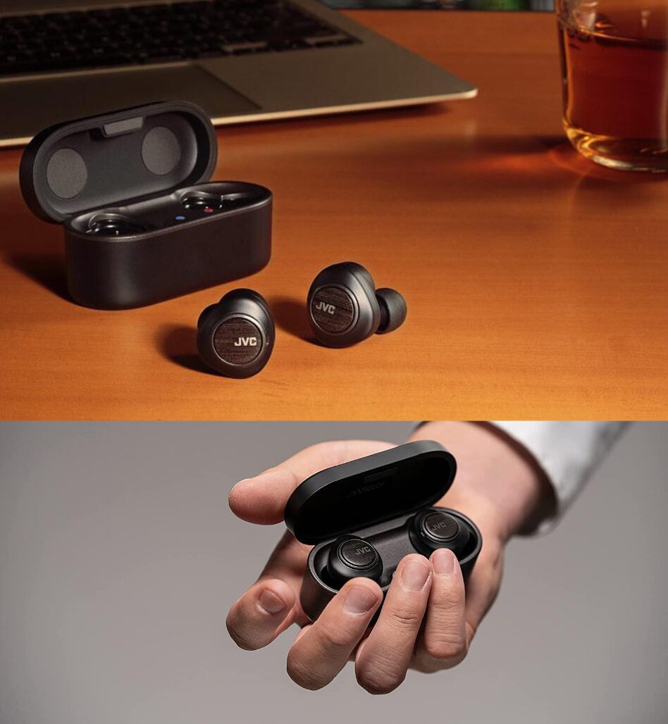 JVC tuotteita omalla painatuksella ja logolla-Belentia Liikelahjatalo. True Wireless Bluetooth vastamelukuulokkeet, Wood Dome True Wireless Bluetooth.