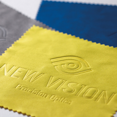 Mukana kaiverrettu logosuunnittelu toisella sivulla. 100 % mikrokuituinen puhdistusliina lian, pölyn ja öljyisten tahrojen poistamiseen herkiltä pinnoilta, kuten aurinko- ja silmälaseilta, kameralinsseiltä ja elektronisten laitteiden näytöiltä. Mukana sahalaitaiset reunat ja jokainen kappale on erikseen paketoitu. Tuote voidaan valmistaa kolmessa eri koossa 12x12cm, 12x17cm, 15x17cm.